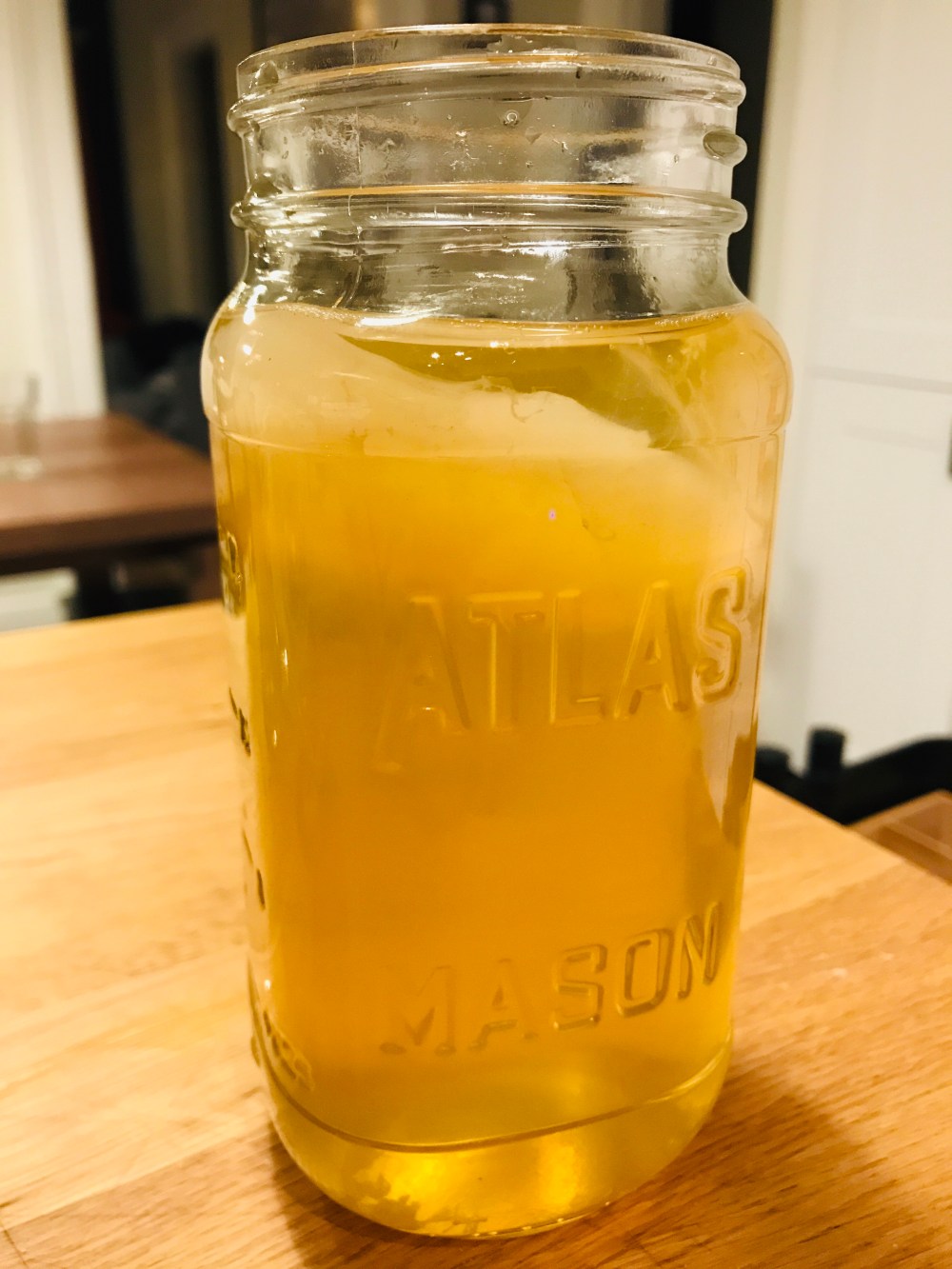 Ajoutez le kombucha dans lequel votre symbiote flottait (le starter) ou du vinaigre blanc distillé si vous n’en avez ps (je n’ai jamais testé cette option mais elle peut être utile).