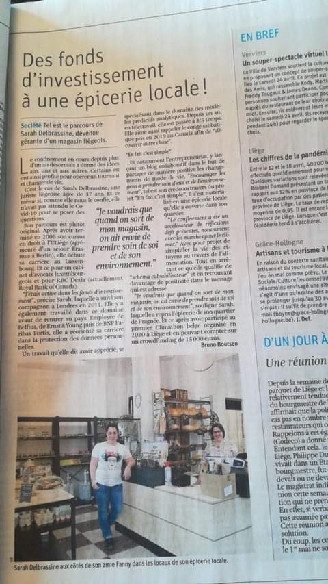 Afin de combattre positivement la morosité qui commençait à s’installer dans ma ville à cause des travaux du tram qui s’enlisaient depuis plusieurs années et de motiver les gens à revenir vers le centre ville et ses commerces (dont le mien), j’ai eu l’idée d’une balade à la redécouverte des commerces. J’ai proposé à une influenceuse liégeoise d’organiser l’événement avec moi et reçu le soutien de mon employeur ainsi que de la ville de Liège. Cet événement spontané organisé en un mois et demi a eu énormément de succès et nous avons arrêté les inscriptions à 300 personnes afin de rendre cette première édition agréable pour tous. La télévision locale m’a invitée pour en parler en novembre 2023 sur leur plateau pour le JT de midi. Trois mois avant le lancement de mon Epicerie j’ai lancé un crowdfunding. En à peine trois jours’ la campagne de crowdfunding a franchi le premier pallier de 5500 euro pour dépasser les 8000 euro ce qui a attiré l’attention de la presse en janvier 2021.Ma décision de sortir quelque chose de positif du confinement et des très longs mois de confinement suivis de télétravail à 100% a également intéressé la presse nationale avec notamment un article dans le journal La Libre en avril 2021.Rencontre avec Madame Christine Morreale, Vice-Présidente du Gouvernement wallon, Ministre de l’Emploi, de la Formation, de la Santé, de l’Action sociale et de l’Économie sociale, de l’Égalité des chances et des Droits des Femmes – 25 février 2022Quand le choix du nom de mon projet fait l’objet d’un canular téléphonique à la radio… Des centaines de milliers de vues et un canular qui ressort de temps en temps des archives et qui reste toujours aussi drôle. Radio Contact – février 2022Quand on lance son activité entrepreneuriale tout en gardant son autre boulot à 4/5ème, on doit parfois faire preuve d’imagination quand les personnes auxquelles on délégue notre projet sont malades. C’est l’occasion aussi de réfléchir autrement et, dans ce cas-ci de démontrer qu’il y a une véritable entraide dans le domaine de l’entreprendrait durable en laissant le magasin, le temps d’une journeee, au gérant d’une autre épicerie durable ainsi qu’à mon producteur de fruits et légumes. Cette histoire positive et surprenante a conduit à une interview à la radio à une heure de grande écoute. – Vivacité – juin 2023Ma ville, Liège, est connue pour son dynamisme dans la réflexion sur la transition alimentaire, notamment grâce aux actions entreprises par la Ceinture Aliment Terre qui a été notamment mis en lumière dans le film Demain. Quand ils m’ont demandé pour m’interviewer dans le cadre de la mise en avant de certains projets pour le Festival Nourrir Liège en 2022, cela m’a fait prendre conscience que mon projet était devenu un des éléments importants du changement dans ma ville et ça m’a confortée dans ma décision de choisir l’entrepreneuriat pour être actrice de changement.Développer sa résilience quand des imprévus frappent à sa porte – JT 19h30 – RTBF – février 2023Femmes d’Aujourd’hui, supplément Délices – 24 janvier 2022